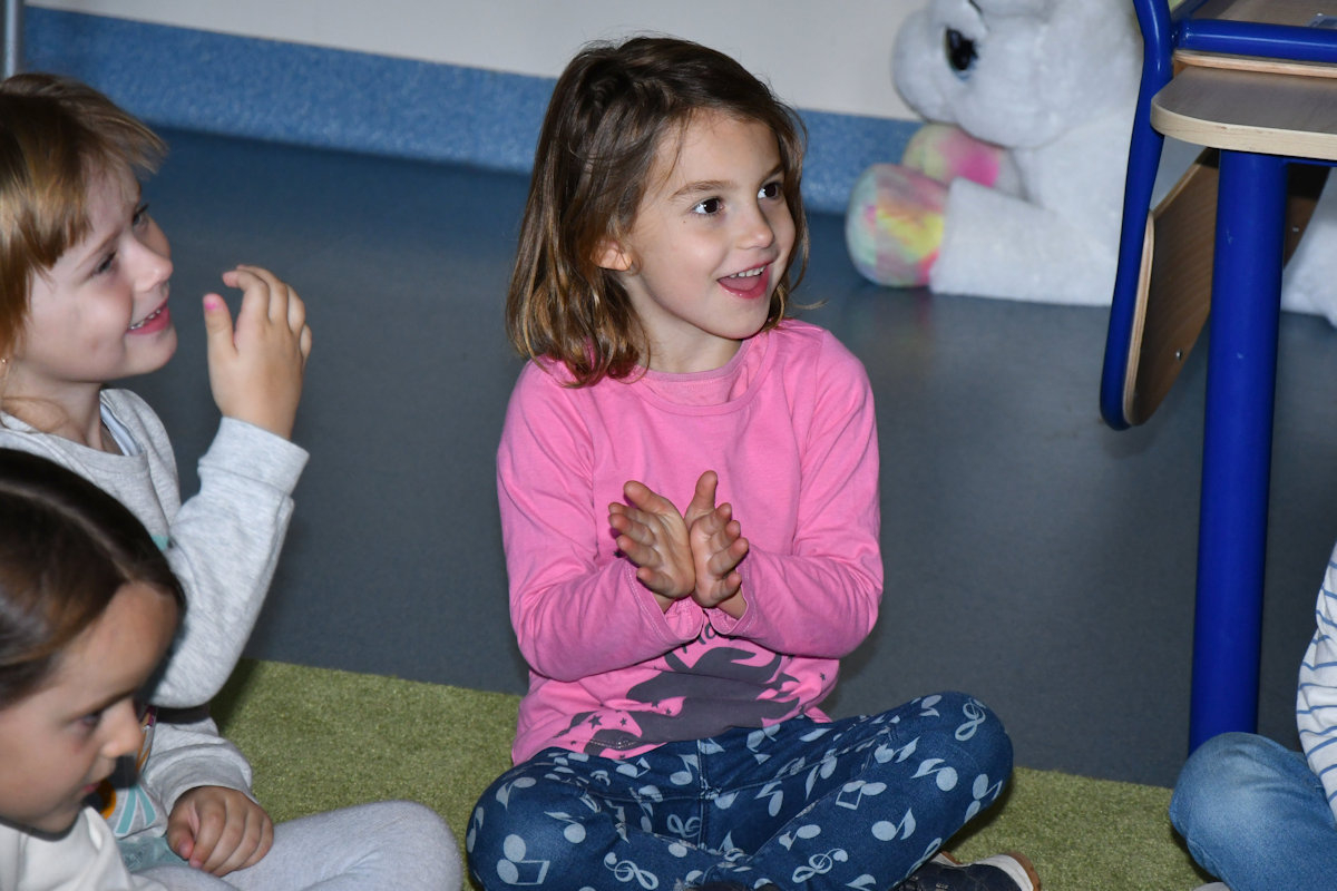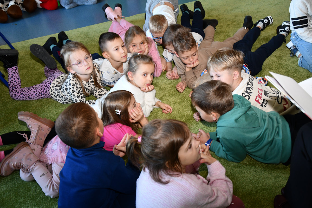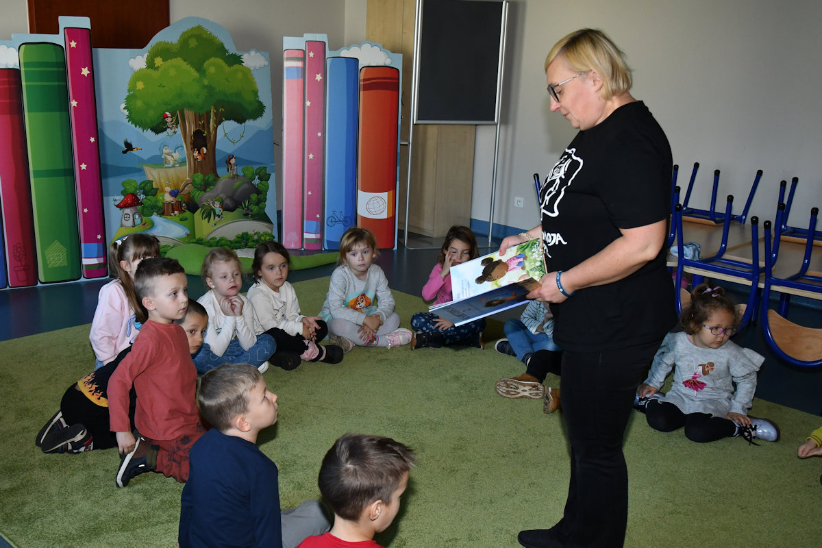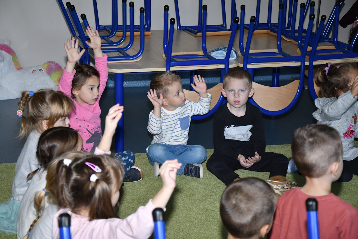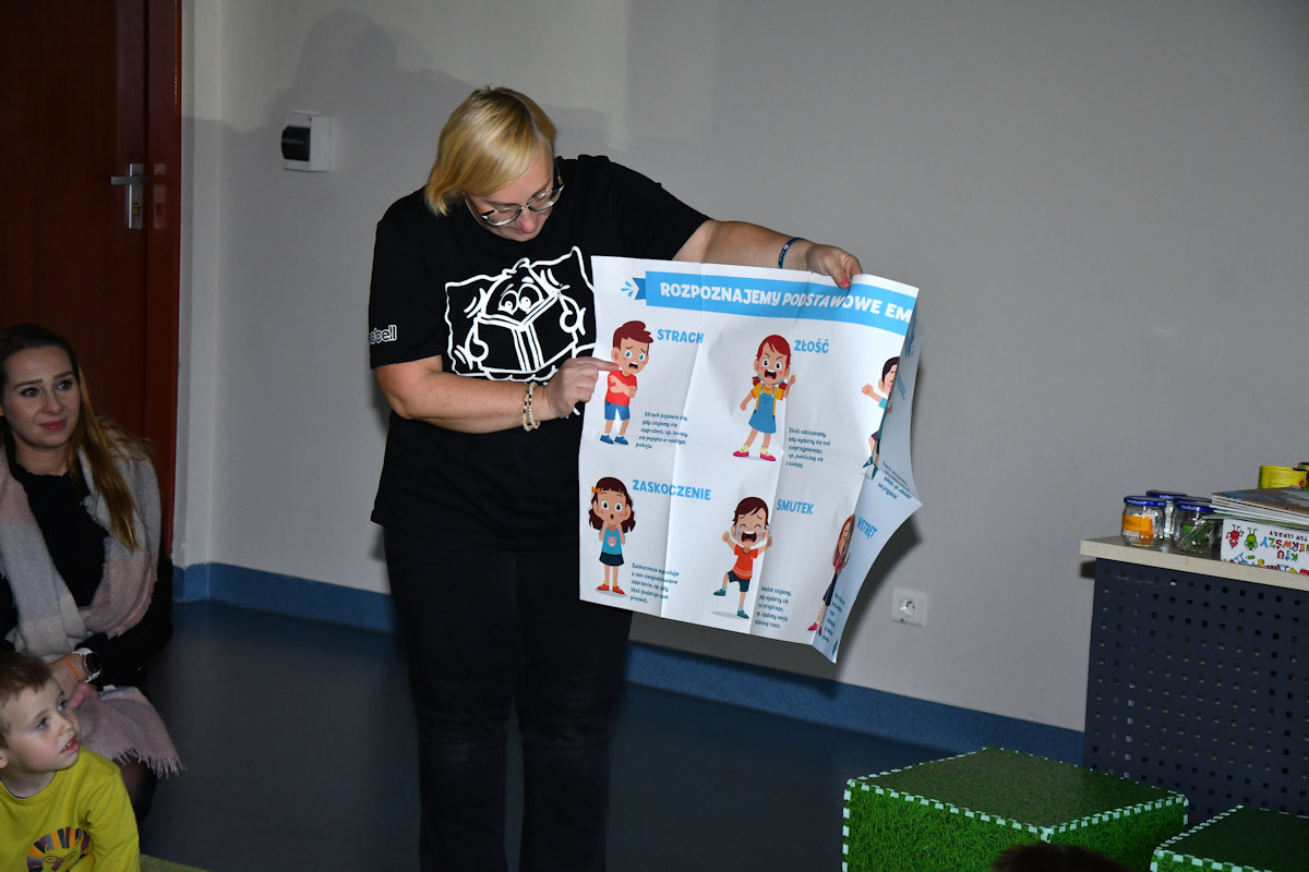 23 października odbyło się kolejne spotkanie z cyklu Kłębek Uczuć. Uczestniczyły w nim dzieci z Przedszkola Niepublicznego Baja Patataja. Zajęcia rozpoczęły się serią ćwiczeń oddechowych z książki autorstwa Christophera Willarda Alfabetoddechy z cyklu –„ABC uważnego oddychania” (Wydawnictwo CoJaNaTo). Następnie dzieci oglądały plansze poglądowe z różnymi rodzajami emocji i uczyły się je nazywać. Po krótkiej chwili relaksującego odpoczynku przedszkolaki wysłuchały z zainteresowaniem książki Kolorowy Potwór Anny LLenas (Wydawnictwa Mamania), po czym przystąpiły do rozwiazywania zagadek związanych z emocjami. Starały się uszeregować emocje za pomocą odpowiednich kolorowych pasków. Na koniec zagrały w ciekawą grę Kto pierwszy ten lepszy potworna wyszukiwanka (Wydawnictwo Fabryka Kart Trefl-Kraków) oraz bawiły się przy piosence Hyc, tup, klap w wykonaniu zespołu Śpiewające Brzdące.