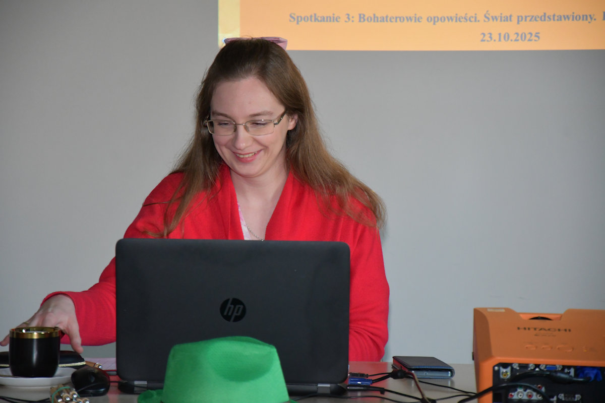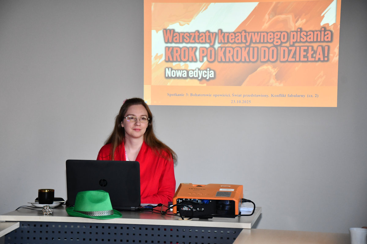 W czwartek 23.10.2025 r. odbyło się trzecie spotkanie w ramach warsztatów kreatywnego pisania „Krok po kroku do dzieła!”. Uczestnicy kontynuowali pracę nad bohaterami i światem przedstawionym w swych opowieściach. Ponadto poznali techniki literackie, które mogli wykorzystać w praktyce podczas ćwiczeń.