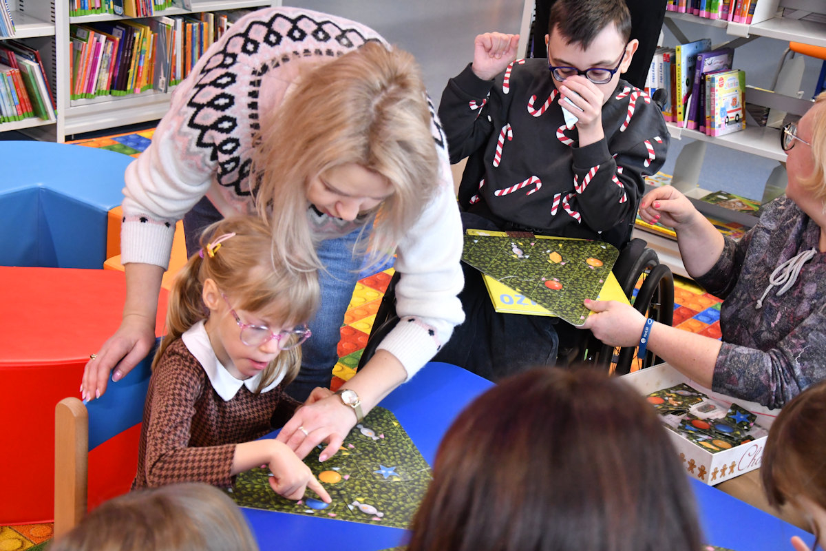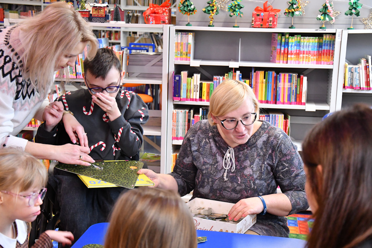 10 grudnia odbyły się ostatnie w tym roku zajęcia z cyklu Kłębek uczuć. W warsztatach wzięły udział dzieci z Ośrodka Rehabilitacyjno–Edukacyjno–Wychowawczego im. Marii Majewskiej w Kielcach, które z uwagą wysłuchały książki Magdaleny Młodnickiej „Boże Narodzenie: świąteczna opowieść z ruchomymi elementami” (Wydawnictwo Jupi Jo!). Zagrały także w grę planszową „Choinka” (Wydawnictwo Nasza Księgarnia), która polegała na złożeniu i udekorowaniu świątecznego drzewka. Następnie z papierowych talerzyków i waty wykonały portret Mikołaja. Na zakończenie uczestniczyły w zabawach paluszkowych z wykorzystaniem rytmicznych, świątecznych wierszyków.