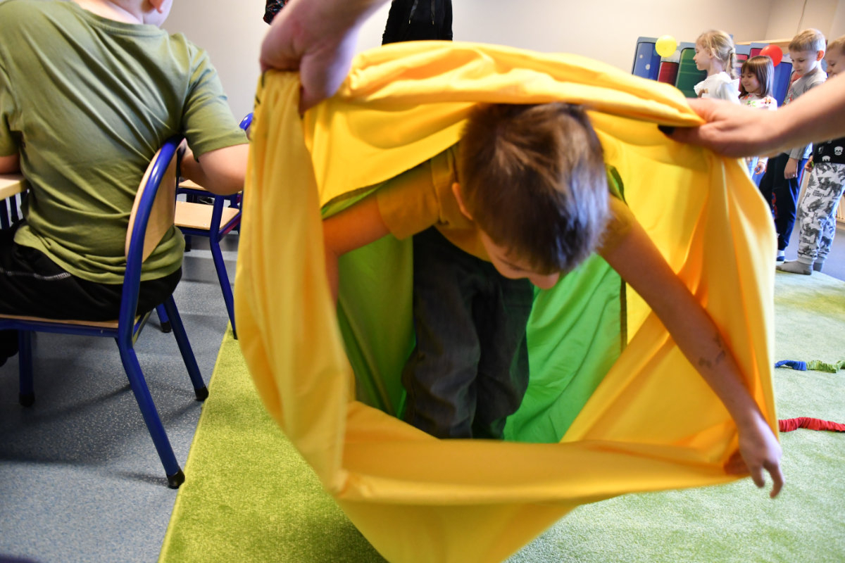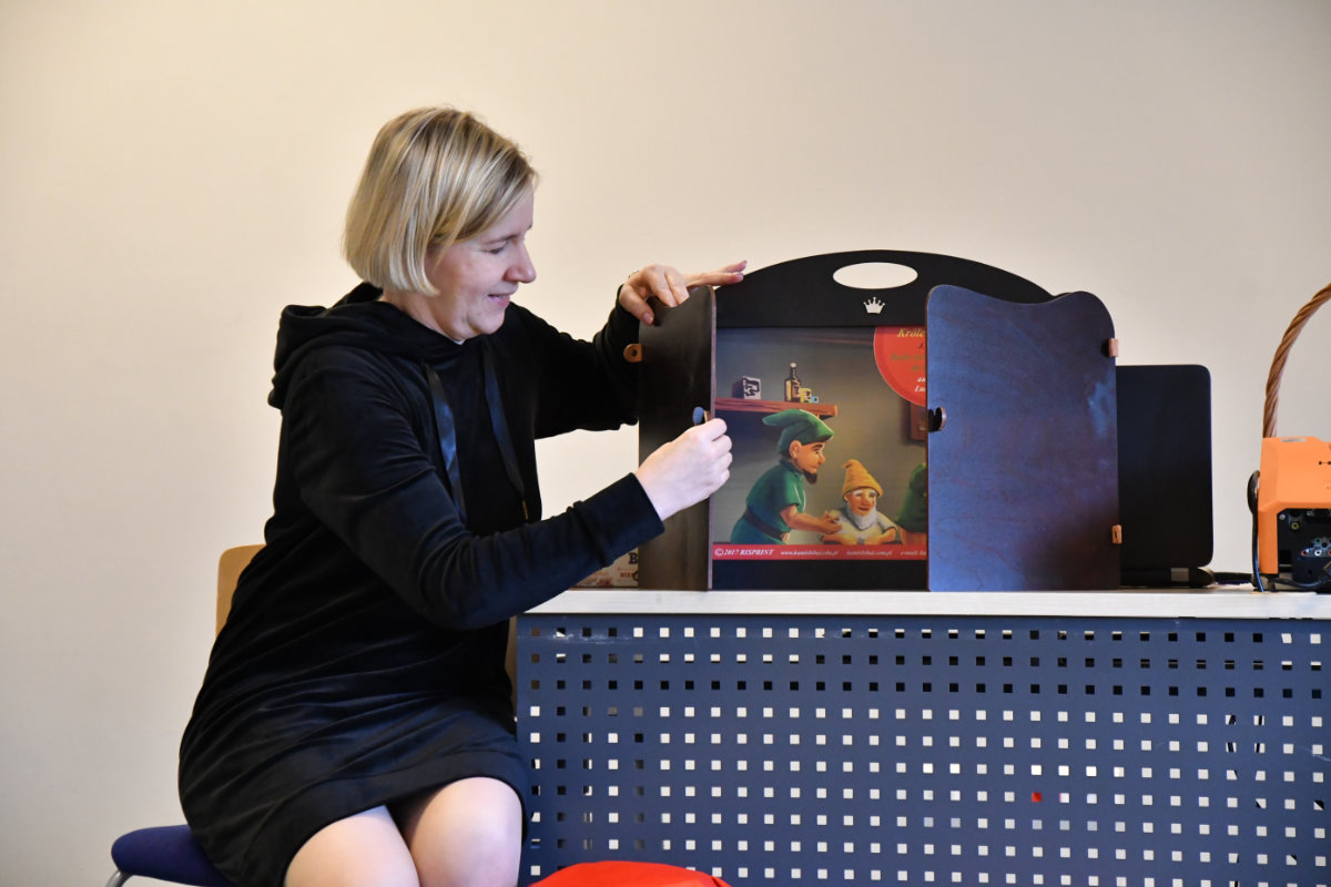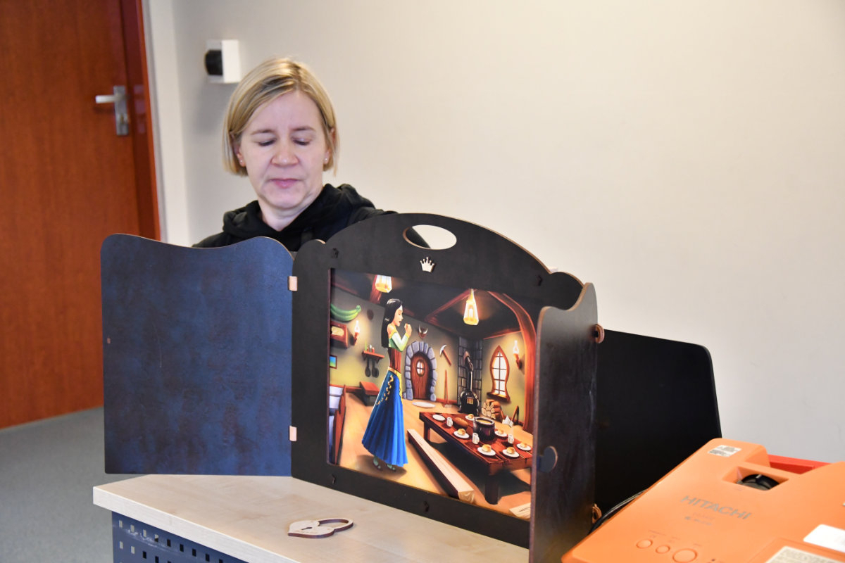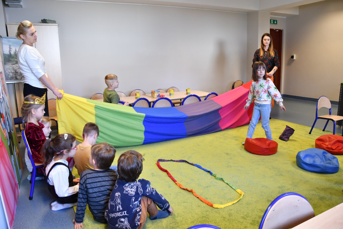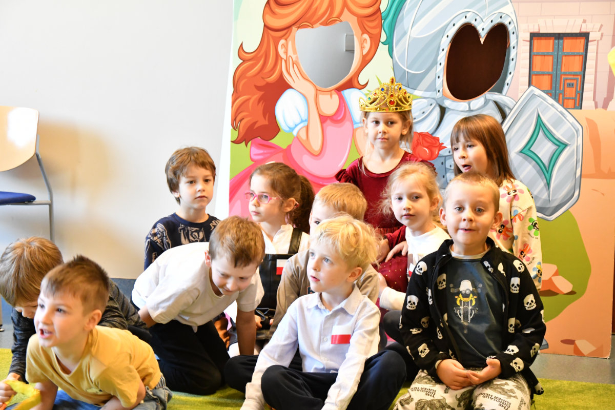 Dnia 13 listopada 2025 na mediateczne spotkanie z cyklu Moja wyobraźnia nie zna granic przybyły przedszkolaki z Przedszkola Baja Patataja. Temat zajęć Królewna Śnieżka już tu nie mieszka przeniósł dzieci do krainy baśni i krasnali. Dzieci obejrzały teatrzyk kamishibai. Zbudowały labirynt dla księcia zdążającego do królewny i samodzielnie go wypróbowały. Nakryły do stołu w domku krasnoludków i odkrywali czarodziejskie fanty. W takt dziecięcych utworów budziły śpiącą królewnę. Na zakończenie wykonały czapki krasnali z gazet i samodzielnie je ozdobiły.