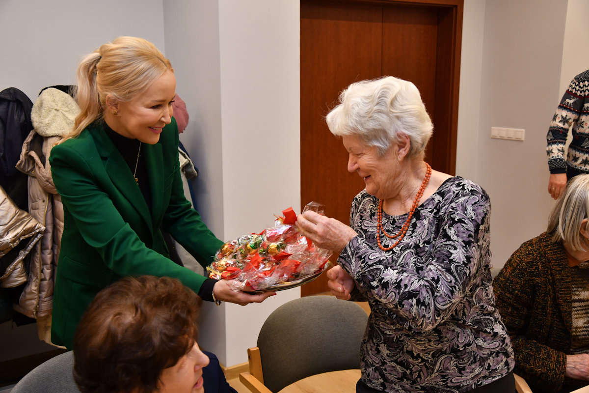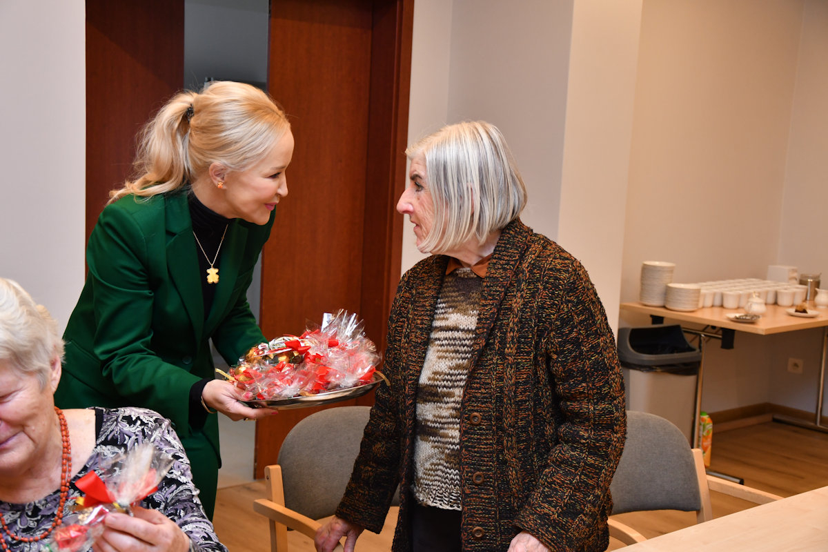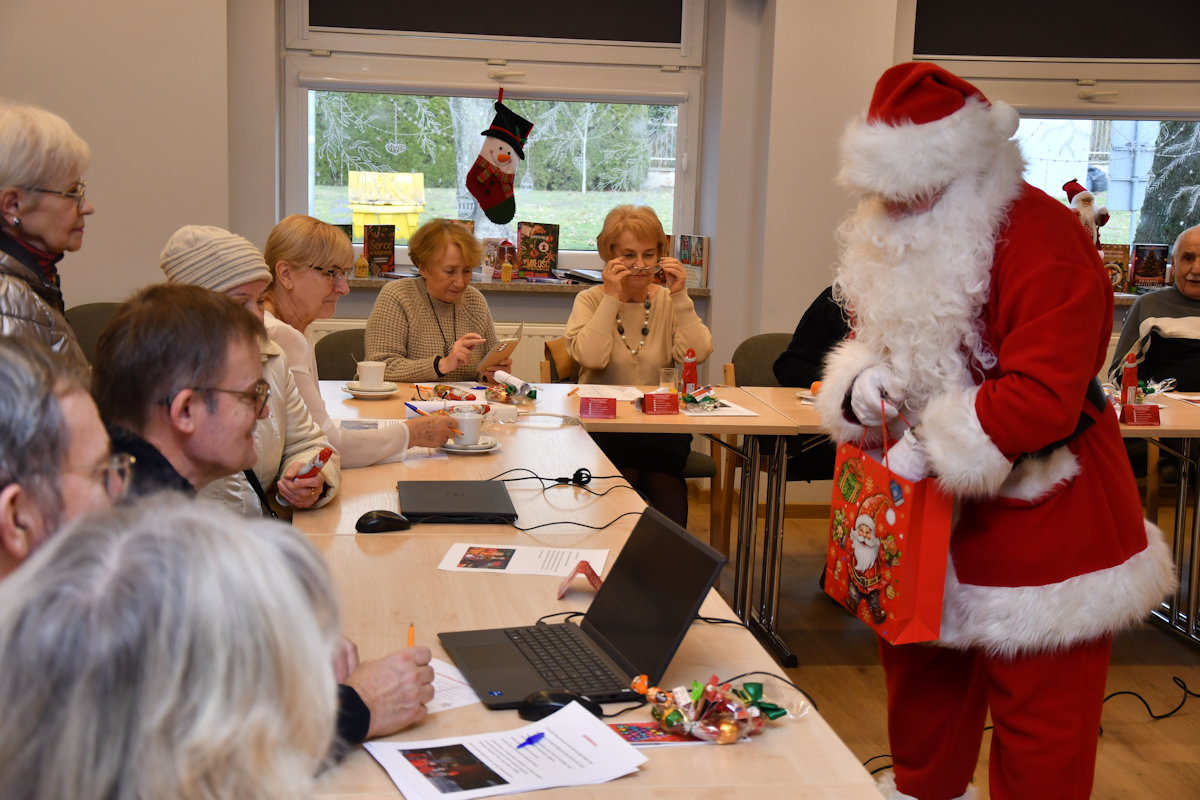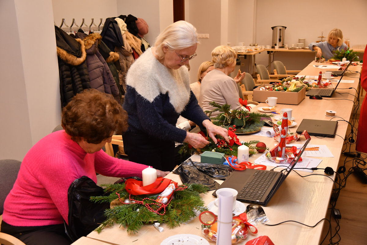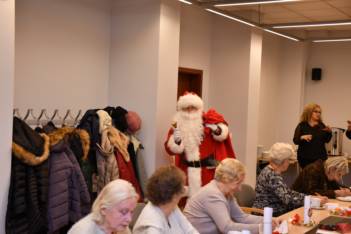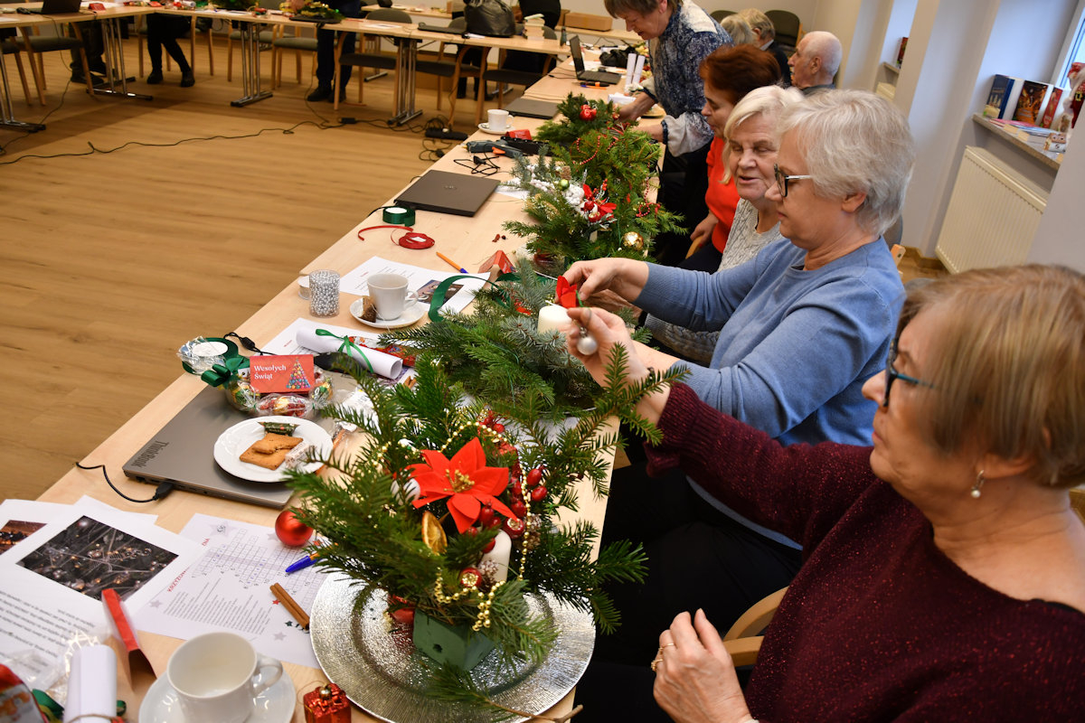 Nie zabrakło również wyjątkowego gościa — Mikołaja, który obdarował uczestników słodyczami, wywołując wiele radości i uśmiechów. Na zakończenie warsztatów seniorzy z dużym zaangażowaniem wykonywali świąteczne stroiki, które z pewnością staną się piękną ozdobą ich domów.