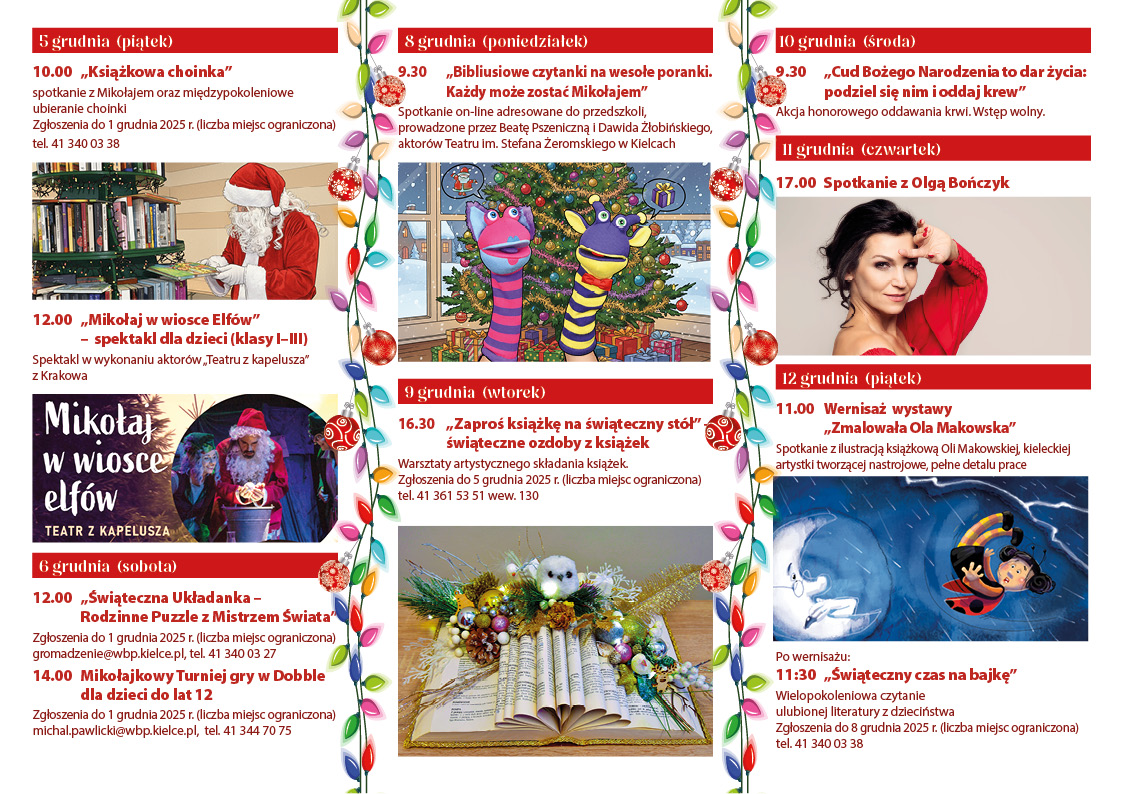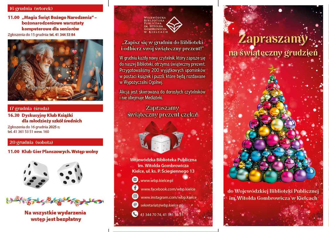 Spędźcie z nami świąteczny grudzień w Wojewódzkiej Bibliotece Publicznej im. W. Gombrowicza w Kielcach. Przygotowaliśmy dla Was miesiąc pełen świątecznych atrakcji – dla dzieci, młodzieży, dorosłych i seniorów. Warsztaty, spektakle, czytanki, wystawy, spotkania i dużo dobrej zabawy – każdy znajdzie coś dla siebie!